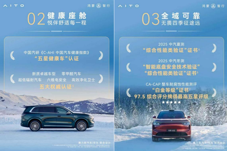 作为聚焦家庭出行的旗舰车型,问界M8将前沿智能科技、极致舒适体验与多元家庭出行场景深度绑定、无缝融合。从座舱体验到动力表现,从智能交互到安全防护,问界M8在每一处细节打磨上都坚守旗舰标准,用细节诠释“新豪华”的核心内涵。而这份对“新豪华”的实践与探索,也得到了专业领域的高度认可与全面肯定。上市一年,其已收获C-NCAP(2024版)超五星安全认证、《C-AHI中国汽车健康指数》“五星健康车”认证、CA-CAP整车耐腐蚀性能测评“白金等级”证书、中汽中心“综合性能类验证”“智能底盘安全技术验证”等多项行业权威认证,全方位印证其作为新豪华标杆的行业地位与核心竞争力。